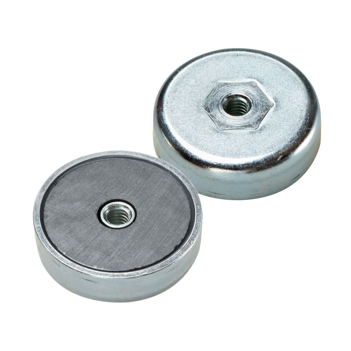 Die Ummantelung unserer Flachgreifer schützt das empfindliche Magnetmaterial vor äußeren Einflüssen. Ihre Haftkraft ist bis zu fünfmal höher als bei Rohmagneten und die Feldlinien werden auf eine Rundfläche geleitet. Die Anschraubmöglichkeiten umfassen Innengewinde, Außengewinde und Mittellochbohrung.