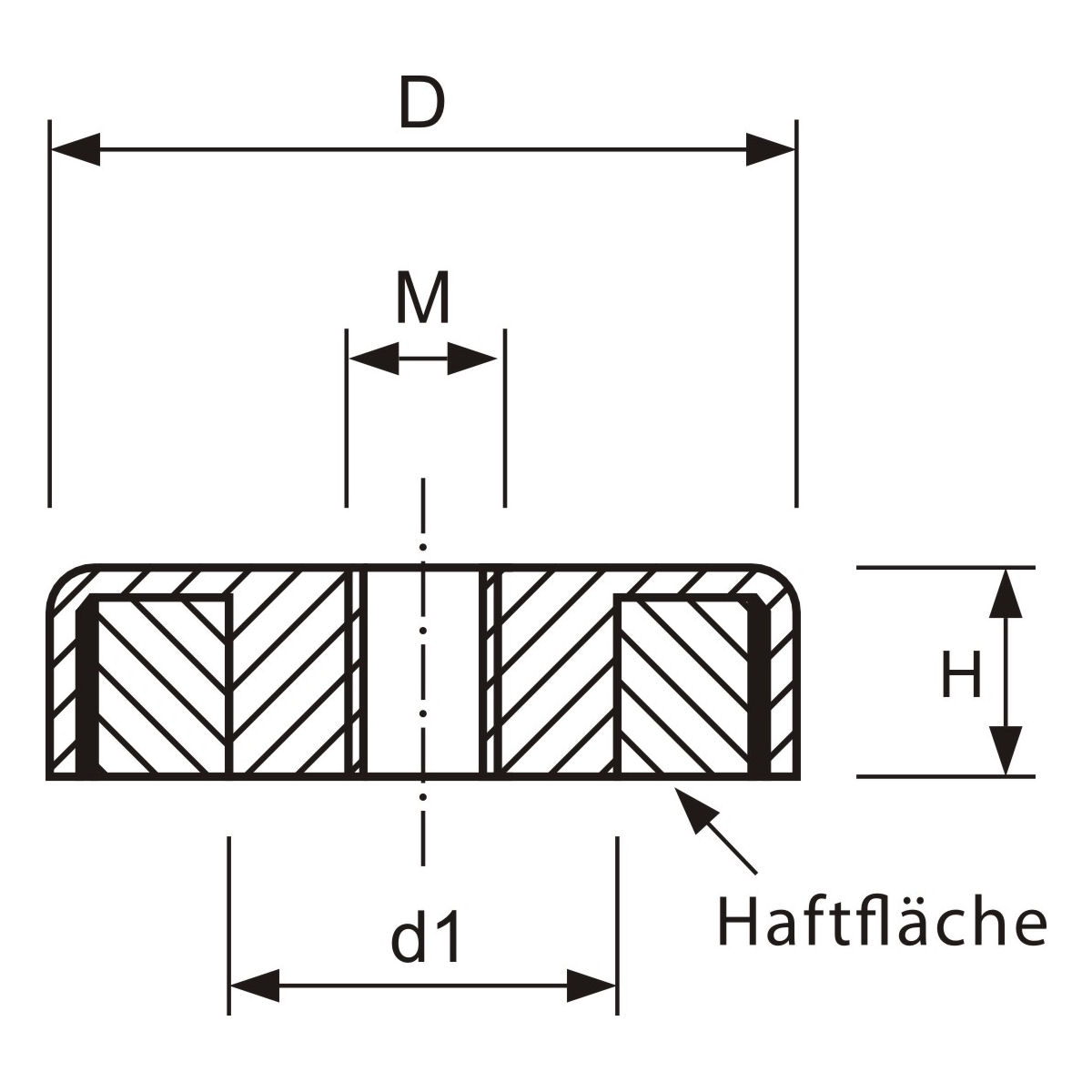 | D in mm | Toleranz D in mm | H in mm | Toleranz H in mm | d1 in mm | Gewinde | Haftkraft in N | max. Einsatztemperatur in °C | Klima | Mantel | |
