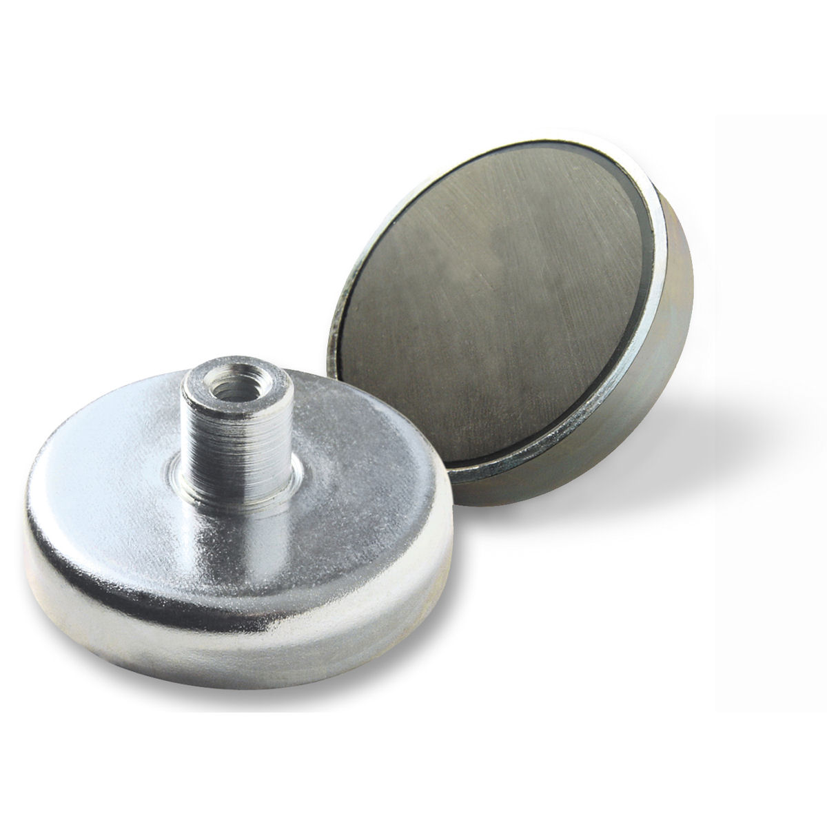 Die Ummantelung unserer Flachgreifer schützt das empfindliche Magnetmaterial vor äußeren Einflüssen. Ihre Haftkraft ist bis zu fünfmal höher als bei Rohmagneten und die Feldlinien werden auf eine Rundfläche geleitet. Die Anschraubmöglichkeiten umfassen Innengewinde, Außengewinde und Mittellochbohrung.