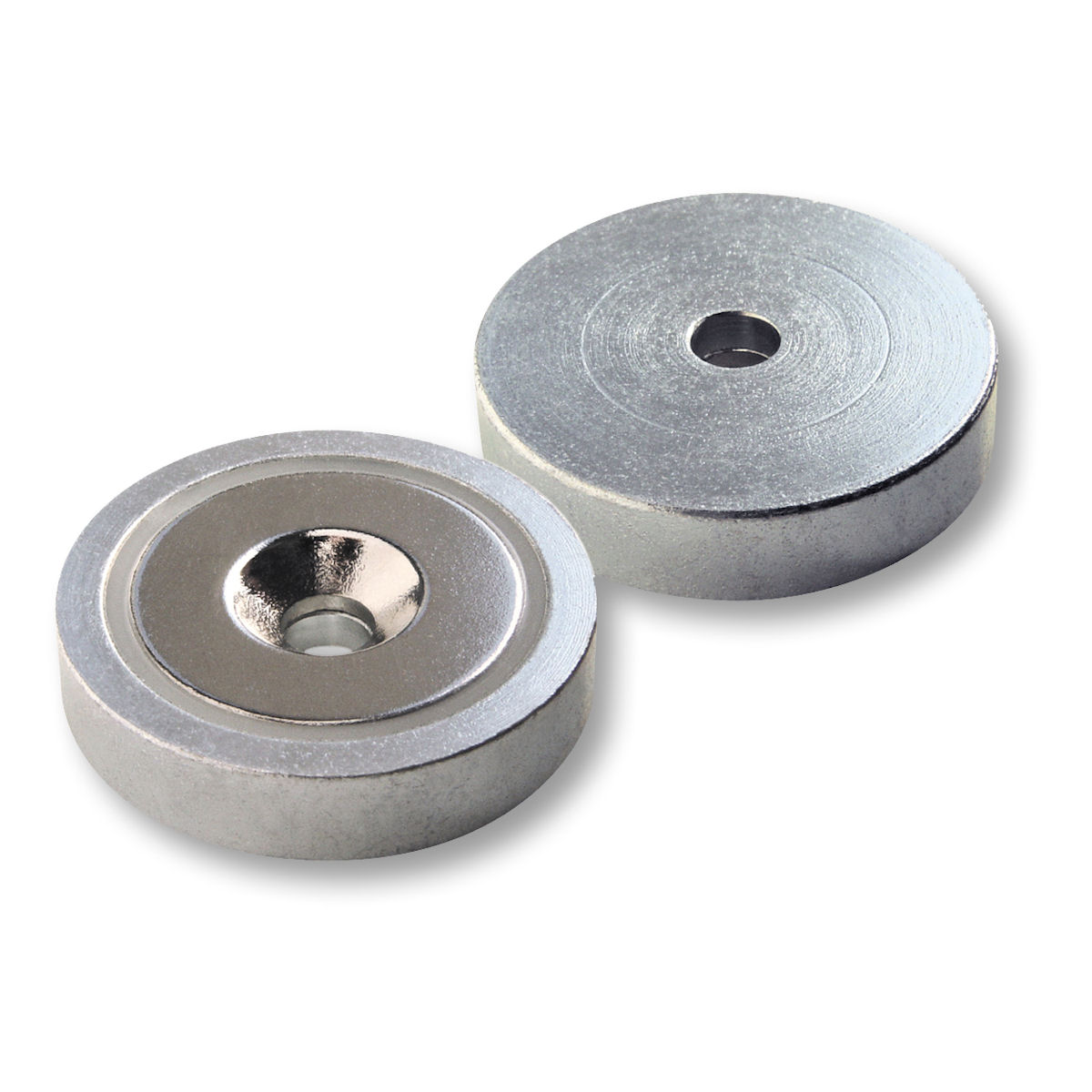 Die Ummantelung unserer Flachgreifer schützt das empfindliche Magnetmaterial vor äußeren Einflüssen. Ihre Haftkraft ist bis zu fünfmal höher als bei Rohmagneten und die Feldlinien werden auf eine Rundfläche geleitet. Die Anschraubmöglichkeiten umfassen Innengewinde, Außengewinde und Mittellochbohrung.