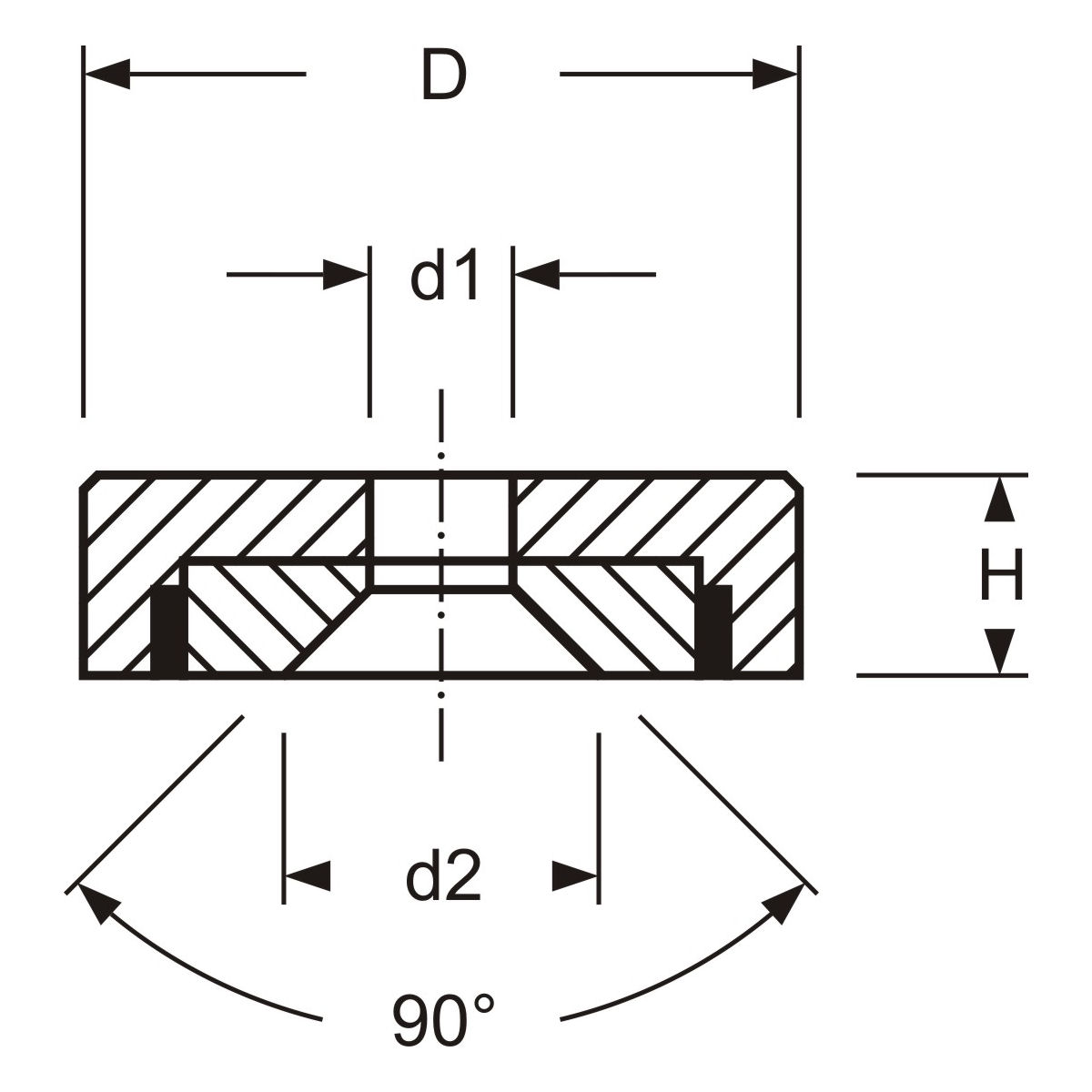 | D in mm | Toleranz D in mm | H in mm | Toleranz H in mm | d1 in mm | d2 in mm | Senkung | Haftkraft in N | max. Einsatztemperatur in °C | Klima | Qualität | Mantel | |