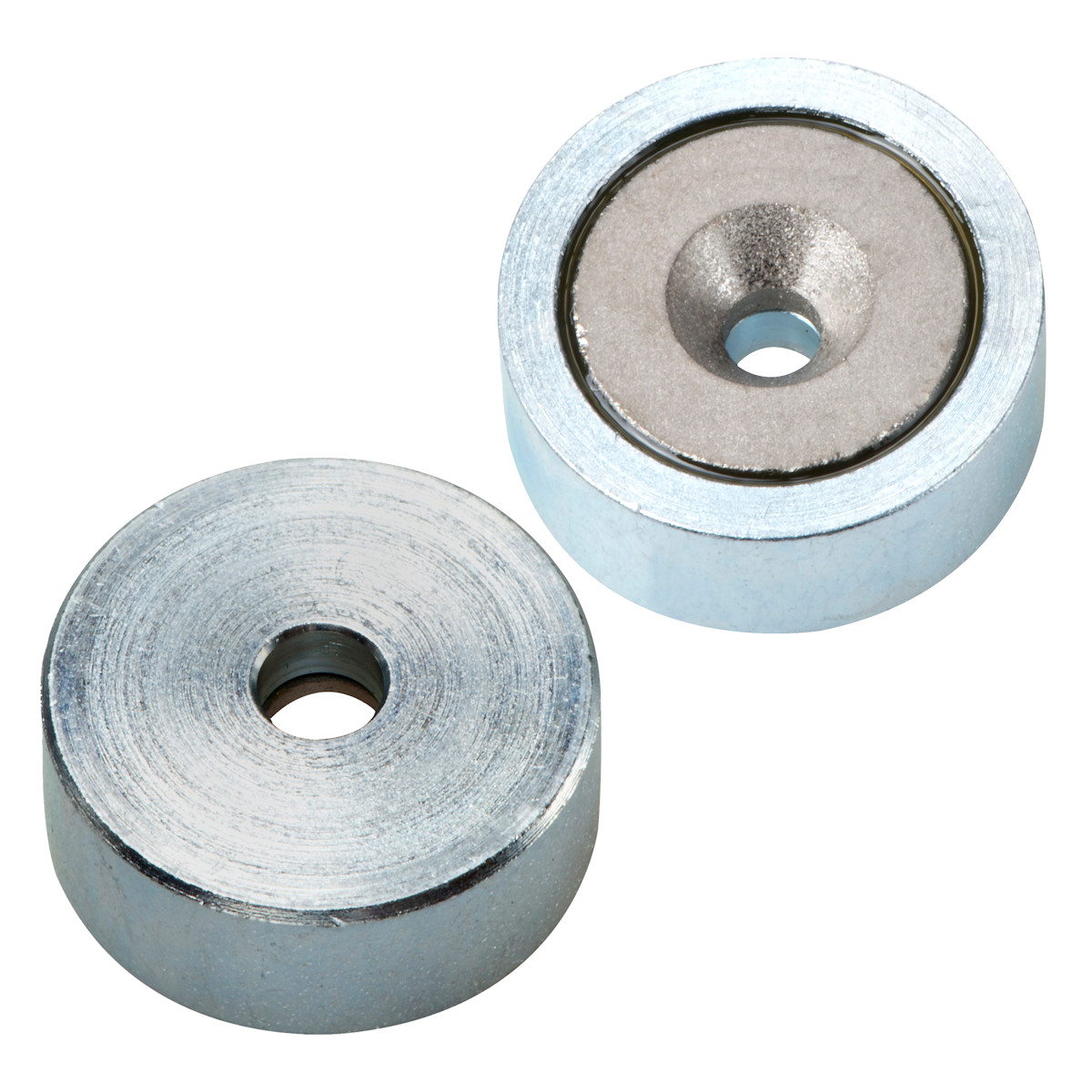 Die Ummantelung unserer Flachgreifer schützt das empfindliche Magnetmaterial vor äußeren Einflüssen. Ihre Haftkraft ist bis zu fünfmal höher als bei Rohmagneten und die Feldlinien werden auf eine Rundfläche geleitet. Die Anschraubmöglichkeiten umfassen Innengewinde, Außengewinde und Mittellochbohrung.