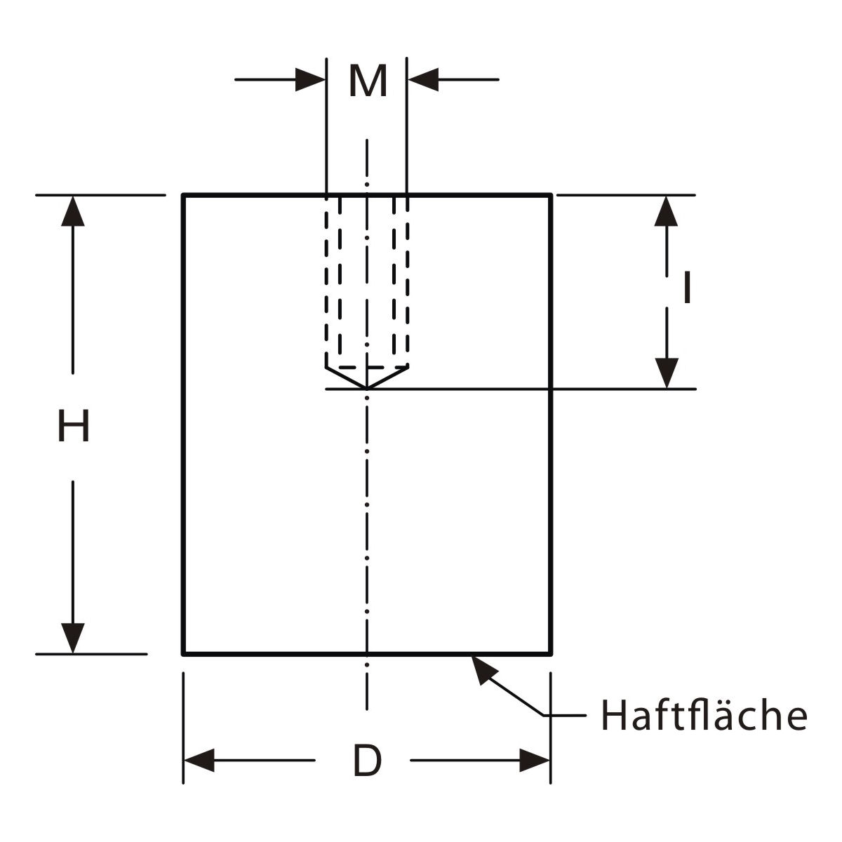 | D in mm | Toleranz D in mm | H in mm | Toleranz H in mm | Gewinde | Haftkraft in N | max. Einsatztemperatur in °C | Klima | Qualität | Mantel | |